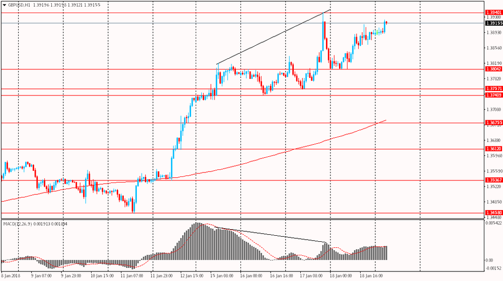 GBP/USD: в ходе азиатской сессии пара выросла к $1.3920. Пара все еще сохраняет бычий сценарий от 3 ноября. Тем не менее, на часовом графике сформировалась медвежья дивергенция по индикатору MACD, что сигнализирует о возможном развитии глубокой коррекции. В этой ситуации наиболее уместным будет искать возможность для покупок пары только после ее окончания. Ближайшей поддержкой выступает уровень $1.3805 (минимум 18 января)