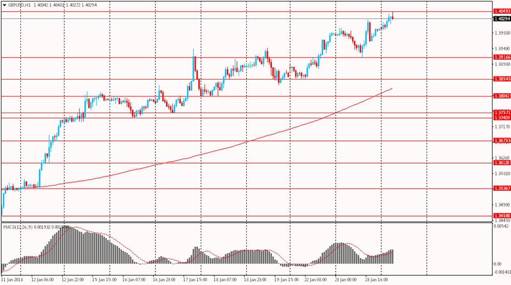 GBP/USD: в ходе азиатской сессии пара выросла к $1.4050. Пара все еще сохраняет бычий сценарий от 3 ноября. Тем не менее, 14-ти дневный индекс относительной силы (RSI (14) на D1), находится выше уровня 70, что сигнализирует о возможном развитии глубокой коррекции. В этой ситуации наиболее уместным будет искать возможность для покупок пары только после ее окончания. Ближайшей поддержкой выступает уровень $1.3915 (минимум 23 января)