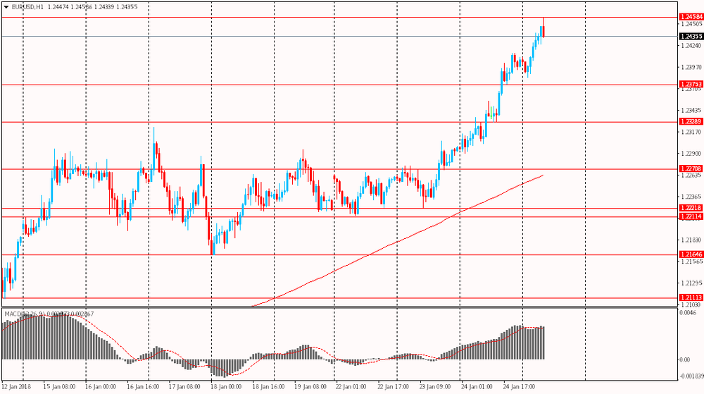 EUR/USD: в ходе азиатской сессии пара выросла к $1.2455. С 12 декабря пара торгуется в рамках общего восходящего канала. Однако, стоит отметить, что 14-ти дневный индекс относительной силы (RSI (14) на D1), находится выше уровня 70, что сигнализирует о возможном развитии глубокой коррекции. В этой ситуации наиболее уместным будет искать возможность для покупок пары только после ее окончания. Ближайшей поддержкой выступает уровень $1.2375 (минимум американской сессии 24 января)