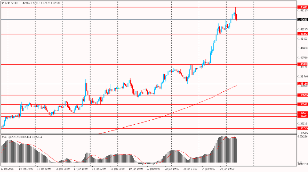 GBP/USD: в ходе азиатской сессии пара выросла к $1.4325. Пара все еще сохраняет бычий сценарий от 3 ноября. Тем не менее, 14-ти дневный индекс относительной силы (RSI (14) на D1), находится выше уровня 70, что сигнализирует о возможном развитии глубокой коррекции. В этой ситуации наиболее уместным будет искать возможность для покупок пары только после ее окончания. Ближайшей поддержкой выступает уровень $1.4185 (минимум американской сессии 24 января)