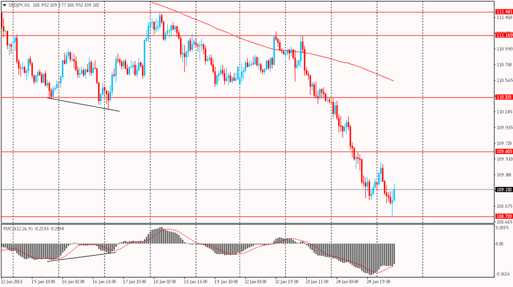 USD/JPY: в ходе торгов азиатской сессии пара упала к Y109.10. Пара продолжает торговаться в рамках общего нисходящего канала от 12 декабря. По этой причине стоит снова присматриваться к продажам пары на коррекциях. Однако, стоит отметить, что 14-ти дневный индекс относительной силы (RSI (14) на D1), находится ниже уровня 30, что сигнализирует о возможном развитии глубокой коррекции. В этой ситуации наиболее уместным будет искать возможность для продаж пары только после ее окончания. Ближайшим сопротивлением выступает уровень Y109.60 (максимум американский сессии 24 января)