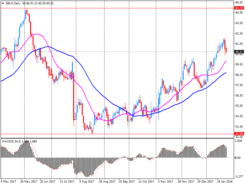 Акции SBUX на премаркете снизились до уровня $57.36 (-5.27%).