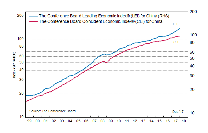 Результаты исследований, опубликованные Conference Board, показали: по итогам декабря ведущий экономический индекс (LEI) для Китая вырос на 1,7 процента, и составил 122,6 пункта (2010=100). Напомним, индекс зафиксировал повышение на 1,9 процента в ноябре и увеличение на 1,5 процента в октябре. В течение шести месяцев (с июня по декабрь 2017 года) показатель вырос на 9,3 процента после того, как повысился на 9,1 процента за предыдущий шестимесячный период (с мая по ноябрь 2017 года).