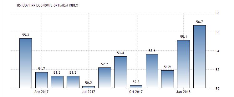 Данные показали, что индекс экономического оптимизма в США, рассчитываемый газетой Investor's Business Daily и исследовательской фирмой TechnoMetrica Institute of Policy and Politics, значительно улучшился в феврале, и достиг самого высокого уровня с октября 2014 года. Индекс вырос до 56,7 пункта с 55,1 пункта в январе, при этом эксперты ожидали, что он повысится лишь до 55,4 пункта. Напомним, значение индекса выше 50 пунктов указывает на оптимизм. Стоит подчеркнуть, индекс находится выше уровня 50 уже 17 месяц подряд, что является самой длительной серией более чем десятилетие. Вместе с тем, сейчас индекс находится на 12,3 пункта выше показателя декабря 2007 года, когда экономика вступила в рецессию.