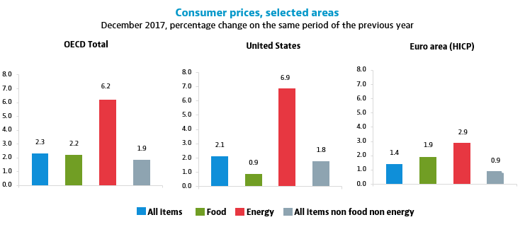 Данные, представленные Организацией экономического сотрудничества и развития, показали, что годовая инфляция в регионе ОЭСР в декабре 2017 года замедлилась до 2,3% по сравнению с 2,4% в ноябре 2017 года. Стоит подчеркнуть, что замедление инфляции было зафиксировано впервые за 6 месяцев. Последнее небольшое снижение годовых темпов инфляции было обусловлено более слабыми темпами роста цен на энергоносители в декабре (+6,2%), чем в ноябре (+7,8%). Инфляция цен на продовольствие ускорилась до 2,2% по сравнению с 2,0% в ноябре. Без учета продовольствия и энергетики, инфляция несколько выросла в декабре - до 1,9% по сравнению с 1,8% в ноябре.