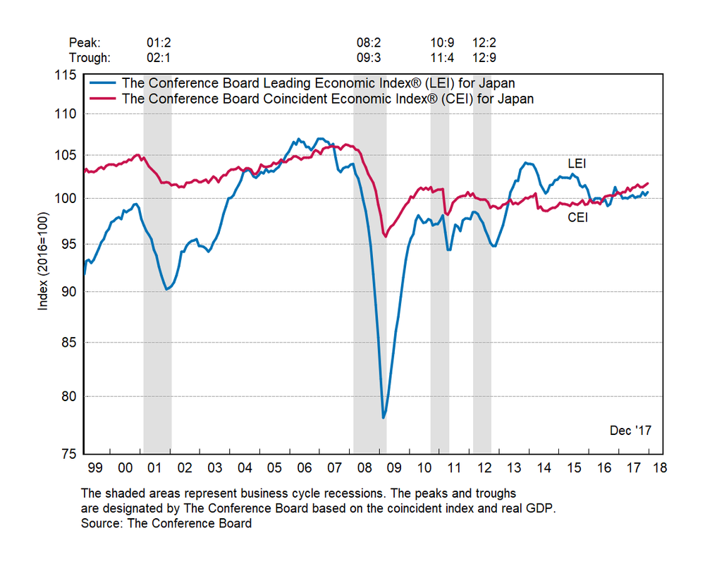 Результаты исследований, опубликованные Conference Board, показали: по итогам декабря ведущий экономический индекс (LEI) для Японии вырос на 0,3 процента, и составил 100,7 пункта (2010=100). Напомним, индекс зафиксировал падение на 0,3 процента в ноябре и увеличение на 0,5 процента в октябре. В течение шести месяцев (с июня по декабрь 2017 года) показатель вырос на 0,3 процента после того, как повысился на 0,2 процента за предыдущий шестимесячный период (с мая по ноябрь 2017 года).