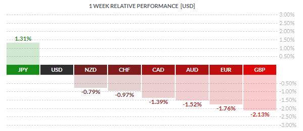 По итогам недели почти все основные валюты продемонстрировали снижение. Наибольшее падение по отношению к доллару США показал британский фунт (-2,13%). Меньшее снижение зафиксировали евро (-1,76%), австралийский доллар (-1,52%), канадский доллар (-1,39%), швейцарский франк (-0,97%), и новозеландский доллар (-0,79%). Укрепление продемонстрировала только японская иена (+1,31%).