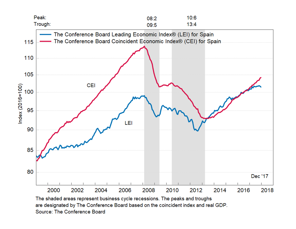 Результаты исследований, опубликованные Conference Board, показали: по итогам декабря ведущий экономический индекс (LEI) для Испании снизился на 0,2 процента, и составил 101,5 пункта (2010=100). Напомним, индекс зафиксировал падение на 0,2 процента в ноябре и увеличение на 0,2 процента в октябре. В течение шести месяцев (с июня по декабрь 2017 года) показатель снизился на 0,1 процента после нулевого изменения за предыдущий шестимесячный период (с мая по ноябрь 2017 года).