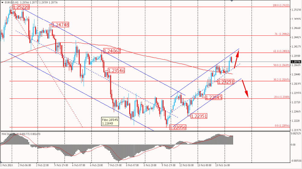 EUR/USD: в ходе азиатской сессии пара выросла к $1.2390. Пара EUR/USD уже третий день растет и корректируется в рамках общего нисходящего тренда от 1 февраля. Более того, сегодня евро преодолел уровень 50% Fibo и закрепился выше уровня MA 200 H1. По этой причине образовался восходящий канал от $1.2205 в рамках которого и стоит вести свою торговлю.