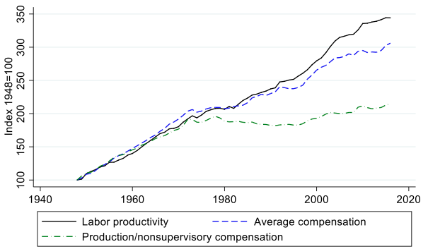 Рост заработной платы для работников среднего класса в США был ужасным за последние десятилетия - в реальном выражении среднемесячная компенсация за период с 1973 по 2016 год увеличилась лишь на 11%. В то же время почасовая производительность труда неуклонно росла, увеличиваясь на 75%.