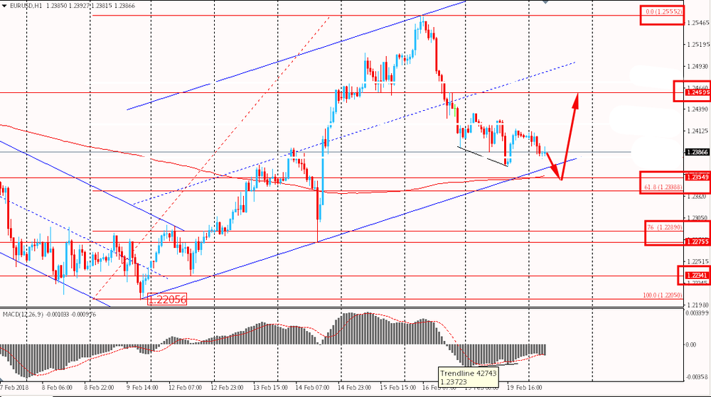 Пара EUR/USD торгуется сегодня утром с небольшим понижением к уровню $1.2380. Евро немного приостановило темпы пятничного снижения, но все равно находится под давлением. В то же время, глобально единая валюта по-прежнему уверенно торгуется выше уровня MA 200 H1 и на данный момент приближается к нижней границе наклонной поддержки восходящего канала, в рамках которого и стоит вести свою торговлю. Более того, стоит отметить, что на часовом графике сформировалась бычья дивергенция по индикатору MACD, что усиливает позиции быков и сигнализирует о возможной смене направления движения цены.