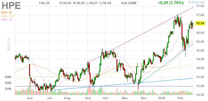 На текущий момент акции Hewlett Packard Enterprise (HPE) котируются по $16,54 (+1,78%)