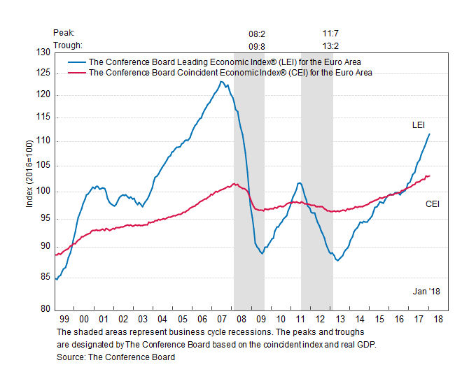 Результаты исследований, опубликованные Conference Board, показали: по итогам января ведущий экономический индекс (LEI) для еврозоны вырос на 0,9 процента, и составил 111,6 пункта (2010=100). Напомним, индекс зафиксировал повышение на 0,8 процента в декабре и увеличение на 0,7 процента в ноябре. В течение шести месяцев (с июля 2017 года по январь 2018 года) показатель вырос на 5,1 процента по сравнению с повышением на 4,6 процента за предыдущий шестимесячный период (с июня по декабрь 2017 года).