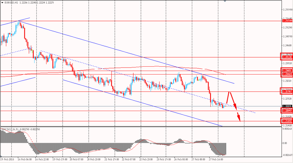 Пара EUR/USD торгуется сегодня утром с небольшим понижением к $1.2215. Паре удалось обновить вчерашний минимум и продолжить падение. На текущий момент пара продолжает оставаться ниже скользящей средний MA 200 H1. Более того, пара торгуется в рамках общего нисходящего наклонного канала от 16 февраля и полностью находится под контролем медведей.