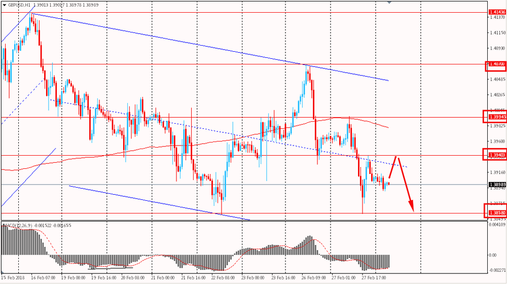 Пара GBP/USD сегодня торгуется в узком боковом движении $1.3890-10 и удерживается вблизи вчерашних минимумов. Напомним, вчера британская валюта резко упала и закрыла день в красной зоне. Помимо этого, пара уверено торгуется ниже скользящей средней MA 200 H1 и ниже сопротивления наклонного нисходящего канала от 16 февраля. Таким образом фунт находится под полным контролем медведей.