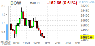 Большинство компонентов индекса DOW в минусе (21 из 30). Лидер роста - Verizon Communications Inc. (VZ, +1.12%). Аутсайдер - United Technologies Corporation (UTX, -2.02%).