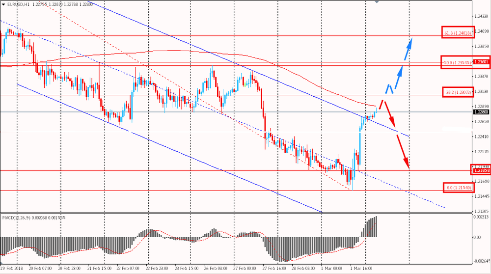 Пара EUR/USD торгуется сегодня утром с небольшим повышением к $1.2285. Евро продолжил вчерашний подъем, сформировавшийся после бучей дивергенции. На текущий момент пара вплотную подошла к уровню сопротивления скользящей средний MA 200 H1 и пытается закрепится выше наклонного сопротивления канала от 16 февраля. Несмотря на последний рост, глобально пара находится под контролем медведей.