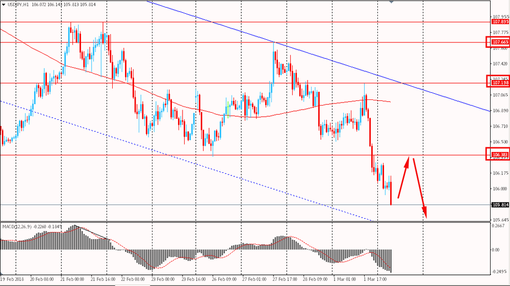 Сегодня пара USD/JPY снова снизилась и просела к уровню Y105.80, продолжив вчерашнее снижение. Стоит отметить, что вчера USD/JPY совершила ре-тест скользящей средней MA 200 H1, оттолкнулась от нее и устремилась вниз в рамках общего нисходящего тренда от 2 февраля. В связи с этим ситуация по USD/JPY остается медвежьей.