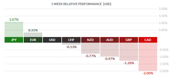 По итогам недели почти все основные валюты продемонстрировали снижение. Наибольший спад по отношению к доллару США показал канадский доллар (-2,00%). Меньшее падение зафиксировали британский фунт (-1,28%), австралийский доллар (-0,97%), новозеландский доллар (-0,77%), и швейцарский франк (-0,13%). Прирост продемонстрировали только евро (+0,31%) и японская иена (+1,07%).