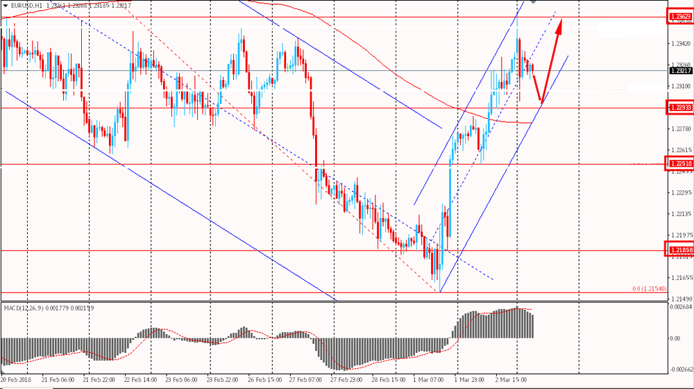 Пара EUR/USD сегодня утром снизилась до $1.2268. В начале сессии евро обновил недельные максимумы, но чуть позже отступил. Евро по-прежнему остается вблизи пятничных максимумов. На текущий момент пара уверенно закрепилась выше уровня скользящей средней MA 200 H1 и пытается закрепится и пытается развить бычий сценарий. Напомним, в пятницу пара вышла за рамки общего нисходящего тренда от 16 февраля и картина по евро стала бычьей.