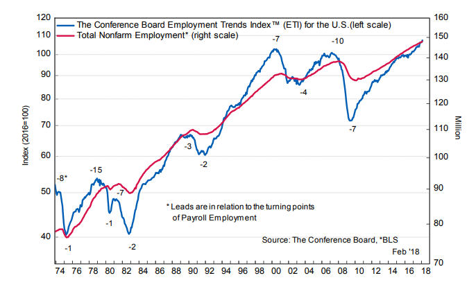 "Индекс тенденций в сфере занятости в феврале ускорился, что говорит о том, что в ближайшие месяцы сильный рост занятости, скорее всего, продолжится», - сказал Гад Леванон, главный экономист по Северной Америки в Conference Board. «Шестимесячный темп роста индекса является самым высоким с 2014 года. Стабильный уровень безработицы в последние месяцы является статистической иллюзией. Рынок труда ужесточается и при таком сильном росте занятости дальнейшее снижение уровня безработицы практически гарантировано ».