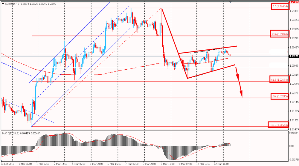 Пара EUR/USD торгуется сегодня утром в диапазоне $1.2325-40. На данный момент евро находится около максимумов последних 2-х торговых дней. Эти дни пара колеблется около $1.2300. Более того, именно по данному уровню сейчас проходит уровень скользящей средней MA 200 H1. Пара пытается преодолеть данную поддержку и развить нисходящее движение. Стоит отметить, что глобально единая валюта сформировала фигуру технического анализа "флаг" и преодолев поддержку 9-12 марта может продолжить нисходящее движение.