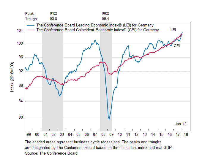 Результаты исследований, опубликованные Conference Board, показали: по итогам января ведущий экономический индекс (LEI) для Германии вырос на 0,5 процента, и составил 103,6 пункта (2010=100). Напомним, индекс зафиксировал повышение на 1,3 процента в декабре и прирост на 0,3 процента в ноябре. В течение шести месяцев (с июля 2017 года по январь 2018 года) показатель вырос на 2,3 процента по сравнению с повышением на 1,8 процента за предыдущий шестимесячный период (с июня по декабрь 2017 года).