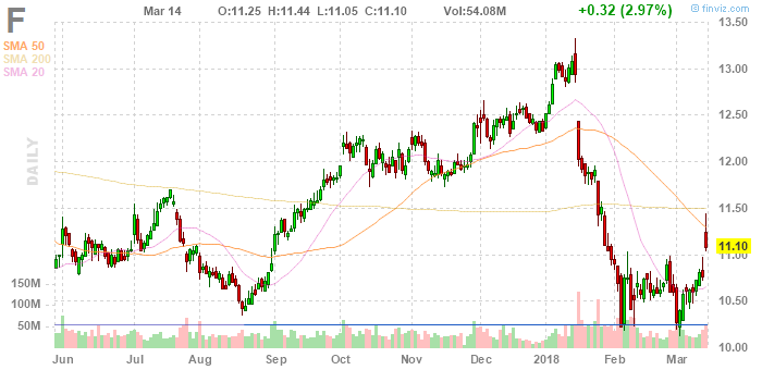 На текущий момент акции Ford Motor (F) котируются по $11,10 (+2,97%)