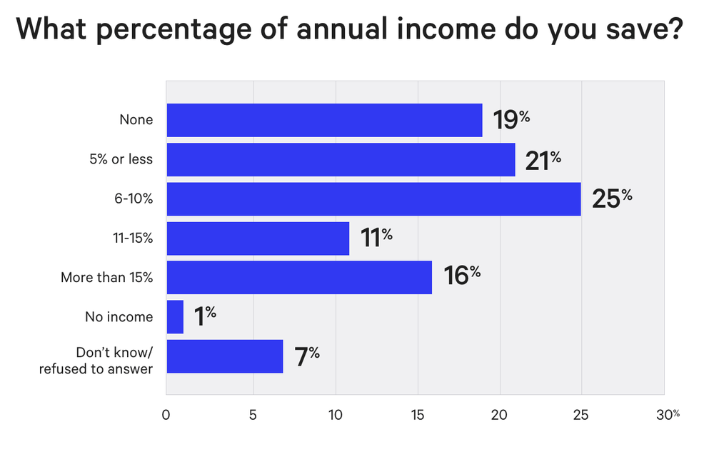 Только 16% респондентов говорят, что они экономят более 15% того, что они зарабатывают, и это то, что обычно рекомендуют делать эксперты. Четверть респондентов сообщили о сбережении от 6% до 10% своего дохода, а 21% заявили, что они откладывают 5% или меньше.