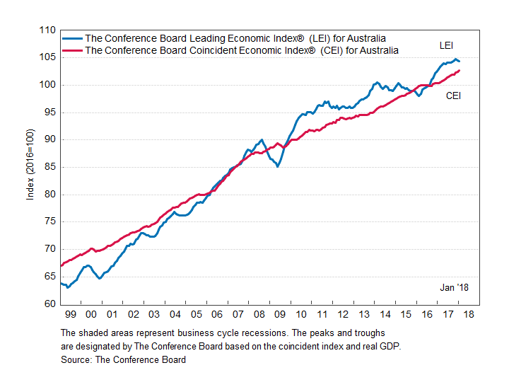 Результаты исследований, опубликованные Conference Board, показали: по итогам января ведущий экономический индекс (LEI) для Австралии снизился на 0,1 процента, и составил 104,4 пункта (2010=100). Напомним, индекс зафиксировал падение на 0,3 процента в декабре и прирост на 0,3 процента в ноябре. В течение шести месяцев (с июля 2017 года по январь 2018 года) показатель вырос на 0,3 процента по сравнению с повышением на 0,4 процента за предыдущий шестимесячный период (с июня по декабрь 2017 года).