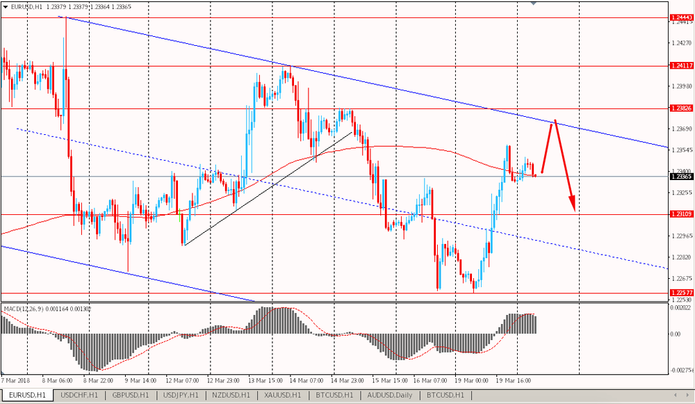 Пара EUR/USD торгуется сегодня утром с понижением, и просела к $1.2265. Пара находится вблизи пятничных минимумов. Напомним, в пятницу пара весь день находилась под давлением и смогла развить нисходящее движение ниже уровня скользящей средней MA 200 H1. Евро продолжает развивать медвежий сценарий в новом нисходящем наклонном канале от 14 марта.