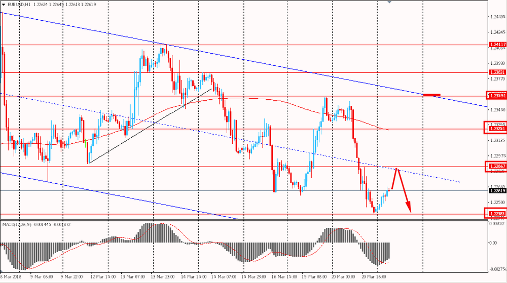 Пара EUR/USD сегодня утром немного выросла к $1.2265. Пара отступает от вчерашнего минимума и корректируется после вчерашнего обвала. Напомним, вчера единая валюта нашла сильное сопротивление на уровне скользящей средней MA 200 H1, после чего и упала. Глобально евро продолжает развивать медвежий сценарий в общем нисходящем наклонном канале от 14 марта.