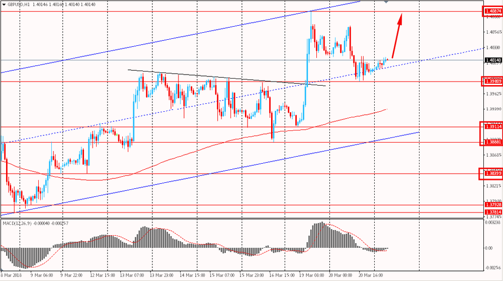 Пара GBP/USD сегодня утром торговалась в диапазоне $1.4000-15. Как и вчера, фунт продолжает удерживать около свои позиции около уровня $1.4. По-прежнему пара находится существенно выше скользящей средней MA 200 H1. Стоит отметить, что британская валюта на данный момент торгуется около срединной линии глобального восходящего канала от 1 марта. Все это говорит о полном доминирование быков.
