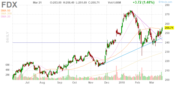 На текущий момент акции FedEx Corp. (FDX) котируются по $255,71 (+1,48%).