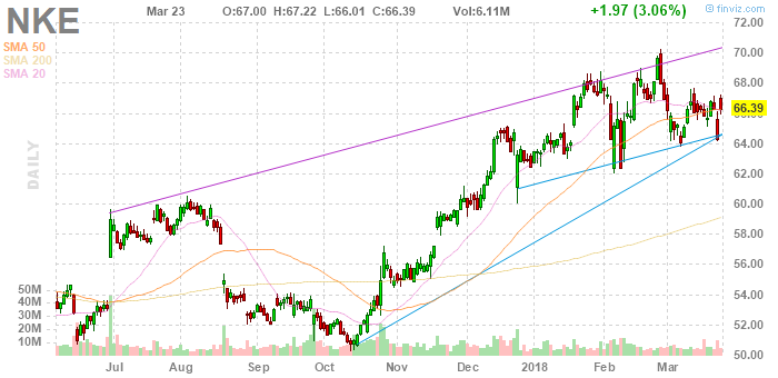 На текущий момент акции NIKE (NKE) котируются по $66.39 (+3.06%).
