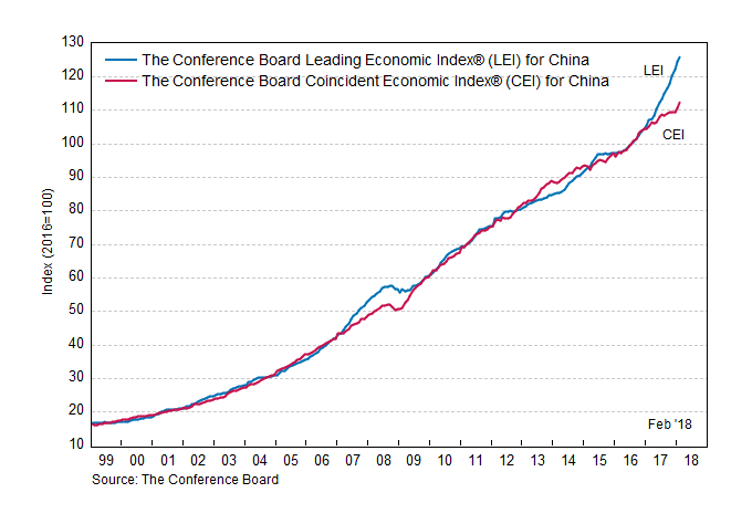 Результаты исследований, опубликованные Conference Board, показали: по итогам февраля ведущий экономический индекс (LEI) для Китая вырос на 1,1 процента, и составил 125,8 пункта (2010=100). Напомним, индекс зафиксировал повышение на 1,9 процента в январе и увеличение на 1,6 процента в декабре. В течение шести месяцев (с августа 2017 года по февраль 2018 года) показатель вырос на 9,3 процента по сравнению с повышением на 9,6 процента за предыдущий шестимесячный период (с июля 2017 года по январь 2018 года).