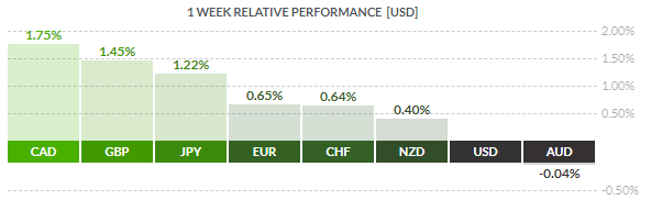 По итогам недели почти все основные валюты продемонстрировали повышение. Наибольший прирост по отношению к доллару США показал канадский доллар (+1,75%). Меньшее повышение зафиксировали британский фунт (+1,45%), японская иена (+1,22%), евро (+0,65%), швейцарский франк (+0,64%), и новозеландский доллар (+0,40%). Снижение показал только австралийский доллар (-0,04%).