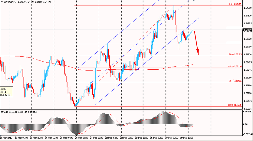Пара EUR/USD сегодня утром немного выросла к $1.2420. Вчера пара стремительно упала и совершила пробой уровня поддержки восходящего канала от 20 марта, а сегодня немного выросла и пытается сделать ре-тест данного наклонного уровня. Если паре удастся это сделать, то сегодня нас может ждать очередной медвежий импульс. В то же время, если пара снова закрепится выше поддержки канала, быки вернут себе инициативу. Также стоит отметить, что фунт все еще торгуется выше уровня скользящей средней MA 200 H1.