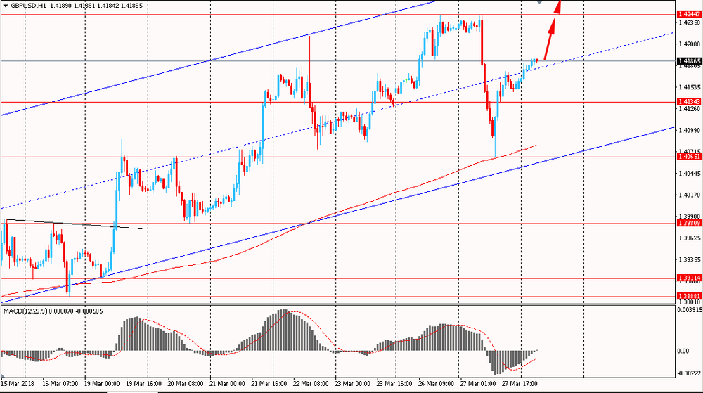 Пара GBP/USD сегодня утром немного выросла к $1.4185. Вчера фунт резко упал и практически коснулся нижней линии поддержки общего восходящего канала. Однако, позже начал восстанавливаться и сегодня продолжает данное восстановление уже преодолев срединную линию бычьего канала от 1 марта. По-прежнему фунт находится существенно выше скользящей средней MA 200 H1. Исходя из всего вышесказанного стоит отметить, что глобально британская валюта находится под полным контролем быков.