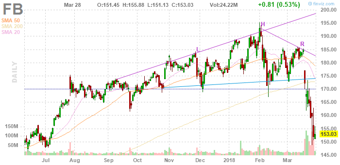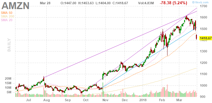 На текущий момент акции Amazon (AMZN) котируются по $1418.67 (-5.24%), а акции Facebook (FB) - по $153.03 (+0.53%).