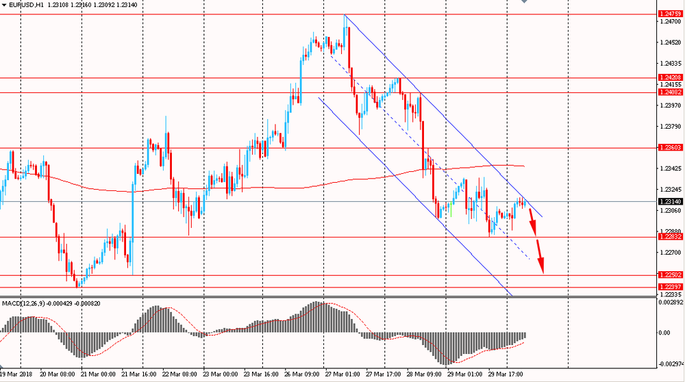 Пара EUR/USD сегодня утром торговалась в диапазоне $1.2290-15, удерживаясь около недельных минимумов. Вчера пара оставалась под давлением и по-прежнему находится ниже уровня скользящей средней MA 200 H1. На данный момент пара коснулась уровня сопротивления нисходящего канала от 27 марта и, вероятно, попытается развить успех медведей.