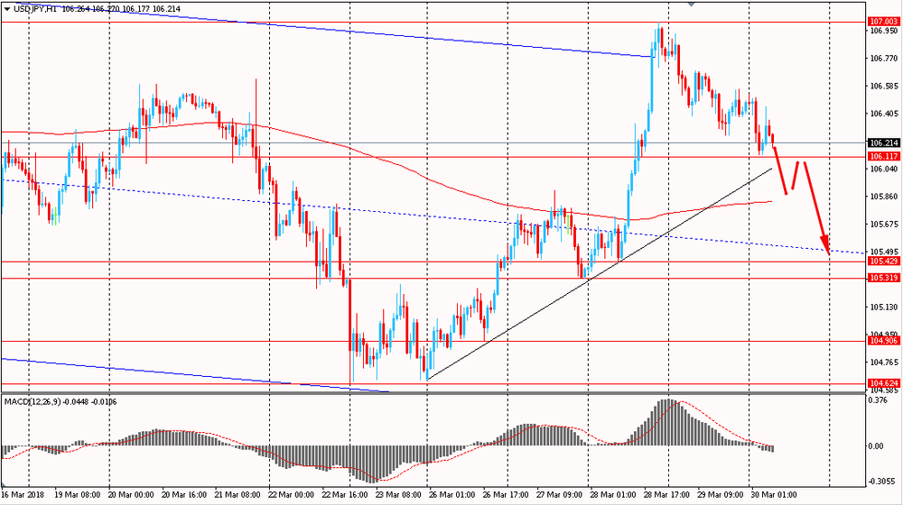 Сегодня пара USD/JPY немного упала к уровню Y106.15, продолжив вчерашнее снижение. Напомним, вчера пара оттолкнулась от линии сопротивления глобального нисходящего тренда от 13 марта и на данный момент приблизилась к поддержке канала от 26 марта. Если паре удастся закрепиться ниже данной поддержки, медведи начнут формировать новый сильный нисходящий импульс.