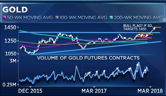 Стратег также видит бычьи признаки на графиках золота, которое, как правило, считаются безопасной гаванью, как только акции начинают падать. По словам Сианы, золото может начать второй квартал на прочной основе. "6 из последних 7 крупных ралли в золоте имели значительно больший объем по сравнению со снижением, которое произошли до этого", - сказал Сиана, ссылаясь на недельный график золота. На том же графике Сиана также указывает, что может формироваться бычий сценарий флаг и это еще один признак того, что золото может демонстрировать восходящую динамику. Все это заставляет Сиана полагать, что волатильность рынка, наблюдавшаяся в первые месяцы 2018 года, может быть воспроизведена в ближайшие несколько месяцев.