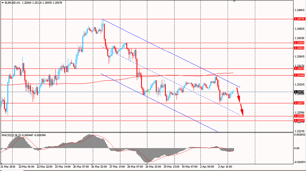 Пара EUR/USD сегодня утром торговалась в диапазоне $1.2290-10. Вчера пара, оттолкнувшись от линии сопротивления нисходящего канала от 27 марта, опустилась и приблизилась к срединной линии канала. Помимо этого, евро по-прежнему торгуется ниже уровня скользящей средней MA 200 H1 и на данный момент находится под контролем медведей. Вероятно, что сегодня пара попытается развить вчерашний успех медведей.