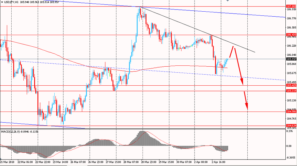Сегодня пара USD/JPY торговалась в диапазоне Y105.70-95, удерживаясь около вчерашних минимумов. Напомним, вчера пара совершила резкое снижение и тестировала на прочность уровень скользящей средней MA 200 H1. Если паре удастся закрепиться ниже, скорее всего нас ожидает формирование очередного медвежьего импульса и продолжения нисходящего тренда от 29 марта. Более того, на 4-х часовом графике пара остается в рамках общего нисходящего канала.