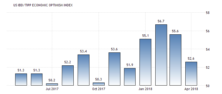 Данные показали, что индекс экономического оптимизма в США, рассчитываемый газетой Investor's Business Daily и исследовательской фирмой TechnoMetrica Institute of Policy and Politics, значительно ухудшился в апреле, продолжив тенденцию марта, и оказавшись ниже прогноза. Индекс упал в апреле на 3,0 пункта, до 52,6 пункта, при этом эксперты ожидали, что он снизится лишь до 55,2 пункта. Напомним, значение индекса выше 50 пунктов указывает на оптимизм. Стоит подчеркнуть, что индекс находится выше уровня 50 уже 19 месяц подряд, что является самой длительной серией более чем десятилетие. Вместе с тем, сейчас индекс находится на 8,2 пункта выше показателя декабря 2007 года, когда экономика вступила в рецессию.