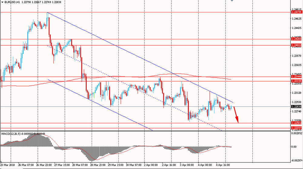 Пара EUR/USD сегодня утром торговалась в диапазоне $1.2275-90. Вчера пара, оттолкнувшись от линии сопротивления нисходящего канала от 27 марта, во второй половине дня опустилась, но далеко от сопротивления не ушла. Помимо этого, евро по-прежнему торгуется ниже уровня скользящей средней MA 200 H1 и на данный момент находится под контролем медведей. Вероятно, что сегодня пара попытается развить недавний успех медведей.