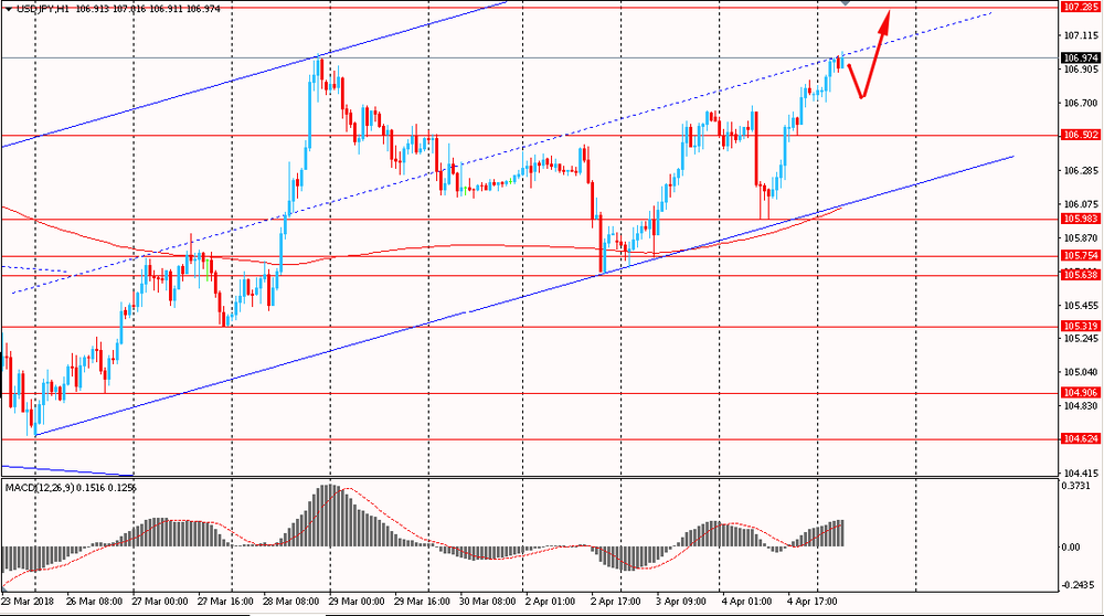 Сегодня пара USD/JPY выросла к Y107.00, продолжая вчерашний подъем. Вчера пара оттолкнулась от линии поддержки общего восходящего канала от 23 марта и скользящей средней MA 200 H1 после чего резко выросла и закрыла день на положительной территории. На данный момент пара подошла к срединной линии бычьего канала и, скорее всего, сегодня продолжит свой подъем.