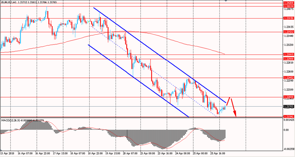Пара EUR/USD сегодня утром торговалась в диапазоне $1.2160-75. Вчера евро, оттолкнувшись от линии сопротивления нисходящего канала, сформировало очередной нисходящий импульс и закрыла день на отрицательной территории. На текущий момент пара все еще торгуется около сопротивления нисходящего канала от 19 апреля и по-прежнему торгуется ниже уровня скользящей средней MA 200 H1, находится под контролем медведей.