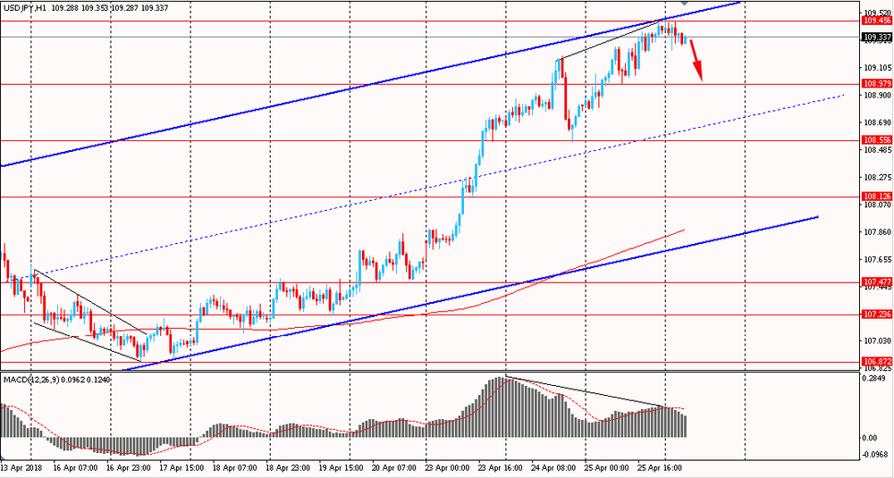 Сегодня пара USD/JPY торговалась в диапазоне Y109.25-45, удерживаясь на вчерашних максимумах. В среду пара показала стремительное движение вверх и закрыла день у линии сопротивления восходящего канала. Тем не менее, стоит отметить, что на часовом графике сформировалась медвежья дивергенция по индикатору MACD, что сигнализирует о возможном формирование глубокой коррекции или развороте цен.